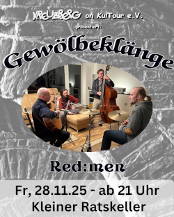 Veranstaltungen im und vom Café Kreuzberg:Samstag den 01.11.2025 Einlass: 20.30 Beginn 21 Uhr "Gewölbeklänge" LWFLD *live* im Kleinen Ratskeller Gewölbeklänge im ältesten Wirtshaus der Stadt mit LWFLD Eintritt frei - Spenden erbeten LWFLD Mit tanzbaren Ohrwürmern, einer unbändigen Leidenschaft und einer ordentlichen Portion Energie im Gepäck bringt LWFLD frischen Wind in die Musikwelt. Mit treibenden Rhythmen, eingängigen Melodien und alltagsnahen Texten schafft er einen Sound, der gleichermaßen ins Herz wie in die Beine geht. 2025 erscheint endlich das Debütalbum, in dem das Songwriting-Talent von LWFLD (ausgesprochen: Lowfield) eindrucksvoll unter Beweis gestellt wird. Mit den neuen Songs, einer eingespielten Band und energiegeladenen Liveshows macht sich LWFLD bereit, die Festivals, Clubs und Herzen der Indie-Szene zu erobern. Fragen und Anmerkungen: goe@kreuzbergonkultour.de Kleiner Ratskeller Jüdenstraße 30 37073 Göttingen Zurück Samstag den 01.11.2025 Einlass: Beginn 21 Uhr Jan Finkhäuser *live* im Old Sabri's Pub (Veranstaltung des Kreuzberg on KulTour e.V.) Eintritt frei - Spenden erbeten Jan Finkhäuser Der Göttinger Musiker Jan Finkhäuser bringt seit über 15 Jahren ordentlich Stimmung in die Kneipen und Pubs in ganz Deutschland. Sein Repertoire erstreckt sich von irischen Balladen und Trinkliedern, die er gern auch unter Einsatz der Mandoline in Szene setzt, bis zu den Klassikern des Rock und Pop. Mit seiner unverwechselbar rauen Stimme und seinem ausdruckstarkem Gitarrenspiel interpretiert er die Songs auf seine ganz eigene Art. Dabei animiert er das Publikum so, dass der Funke überspringt und kräftig geklatscht und mitgesungen wird. Kaum ein Abend gleicht dem Anderen. Mal sorgt er für eine klassische irische Pubatmosphäre, mal beschwört er die Helden der 60er und 70er, indem er mit wilden Gitarrensoli brilliert oder er veranlasst die ganz Kneipe dazu, Lieder aus der neuen deutschen Welle grölen. Manchmal passiert all das und noch mehr an einem Abend. Zusammenfassend lässt sich sagen, Kneipenabende mit Mary’s Bard haben einen hohen Unterhaltungsfaktor und werden vom Publikum so schnell nicht vergessen. ![]() ![]() Old Sabri's Pub Apothekenstraße 6 37115 Duderstadt ![]() Zurück Mittwoch den 05.11.2025 Einlass: 20 Uhr 175. Offene Folksession im Kleinen Ratskeller - Eintritt frei (Veranstaltung des Kreuzberg on KulTour e.V.) Einmal im Monat kommen versierte Tunes-Musiker und Freunde des Folk zusammen, um die grüne Insel in Göttingen musikalisch lebendig werden zu lassen. Ob Irish Tunes oder gesungene irische Weisen – zusammen mit Instrumenten wie Gitarre, Fiddel, Harfe, Tin Whistle, Bodhrán, Dudelsack, Akkordeon, Holzquerflöte, Mandoline bzw. Mandola oder der irischen Bouzouki werden alle Gäste und Musiker jeden Monat auf die kleine Insel entführt. Dazu muss man einfach nur die Augen schließen, der Musik lauschen und an seinem kalten Guinness nippen. Die Irish “tunes”-Musiker bilden den harten Kern und mit ihnen und drumherum entwickelt sich eine offene Session – unter Einhaltung gewisser Nettiquette-Regeln. Jeder Interessierte ist herzlich willkommen, Egal ob Musiker oder Zuhörer! Gespielt wird nicht auf einer Bühne mit Verstärkung sondern rein akustisch in einem lockeren gemütlichen und offenen Kreis. Hier geht es zur Website: ![]() ![]() Infos, Koordination und Anmeldung: zentrale@cafe-kreuzberg.de Kleiner Ratskeller Jüdenstraße 30 37073 Göttingen ![]() Zurück Mittwoch den 05.11.2025 Einlass: Beginn 19 Uhr Ludwig Wright *live* im Harzer Hof Scharzfeld Mittwochskonzerte im Harzer Hof Scharzfeld Eintritt frei - Spenden erbeten Eine Platzreservierung wird empfohlen unter Telefon 05521 994700. Ludwig Wright Ludwig Wright ist ein britisch-deutscher Songwriter, Poet und Performer, der mit selbstverfassten Mitsing-Melodien Rock ’n’ Roll und Folk in Einklang bringt. Musikalisch ist er das Kind von Elvis Presley und Joni Mitchell. Von seinem Vater hat er die Bühnenpräsenz und das charmante Lächeln, von seiner Mutter die klare, starke Stimme und die Fingerpicking-Fertigkeiten. Mühelos überschreitet er Genre-Grenzen und pendelt zwischen den britischen und deutschen Singer-Songwriter- und Folkszenen. Dabei singt er auf Englisch, hat europaweit Straßenshows und bisher über 200 Konzerte gespielt, trat beim Edinburgh Fringe Festival auf und debütierte mit zwei fulminanten Shows beim Rudolstadt Festival 2023. Ludwig Wright ist ein Performer wie er im Buche steht. Er ist auf der Bühne zu Hause, das merkt man gleich. Wenn er seine musikalischen Geschichten erzählt und damit Leute zusammenbringt, schafft er eine rundum wohlige Atmosphäre. Daraus schöpft sein Publikum sowohl Kraft als auch Positivität und summt am Ende nicht nur einen Ohrwurm. ![]() Foto: Daniel Gunther ![]() Harzer Hof Harzstraße 79 37412 Herzberg am Harz ![]() Zurück Donnerstag den 06.11.2025 Einlass: 18, Beginn 19:30 Uhr Der Göttinger Bluegrass Jam *live* im Kleinen Ratskeller Göttingen Der Göttinger Bluegrass Jam Gespielt und improvisiert werden US-amerikanische Songs und Tunes auf typischen Bluegrass-Instrumenten, wie Gitarre, Fiddle, Banjo, Mandoline, Bass, Dobro und allem, was passt. Auch wenn die Melodien in der Regel recht einfach gehalten sind, werden sie durch Gesang und improvisierte Soli aufgepeppt, so dass jeder Song zu einem einzigartigen Erlebnis wird – sowohl für die Musiker als auch für das Publikum. Kein Stück gleicht dem anderen, sie sind immer wieder neu und aufregend. Ein besonderes Highlight des Bluegrass Jam im Kleinen Ratskeller ist, dass die Stücke alle sehr flott gespielt werden – es darf also nicht nur zugehört, sondern auch gerne mitgewippt werden. Vor allem aber lädt die Musik zum mitsingen ein und das ist herzlich willkommen! Der urige Kleine Ratskeller ist die perfekte Kulisse für den Göttinger Fast Bluegrass Jam und versetzt Musiker und Publikum in andere Gefilde. Damit die Bluegrass Jam auch für alle zu einem