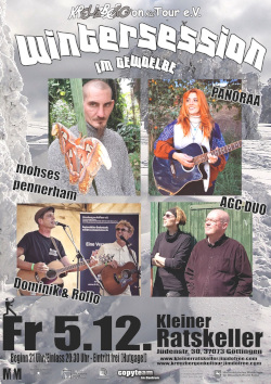 Veranstaltungen im und vom Café Kreuzberg:Samstag den 29.11.2025 Einlass: 18:00 Uhr FROGS Kneipentour 2025 *live* im The Queen's Head, Trou und Stadion Speckstraße 18.00 Uhr - The Queen's Head 20.00 Uhr - Trou 21.30 Uhr - Stadion Speckstraße Eintritt frei - Spenden erbeten FROGS lassen keinen Zweifel: Sie sind die Ramones des Folk Rock – eine lebendige Explosion aus Folk, Rock und Punk mit einer akustischen Wucht, die jedem stilstehenden Fuß vors Schienbein tritt, bis er mitgeht. Warum F.R.O.G.S.? Weil ihr es euch wert seid. Folk Rock frOm Gifted Singers verbinden geschickt traditionelle Melodien mit punkigem Drive. Zwei Gitarren, eine Mandoline, drei Stimmchen mit Durchsetzungskraft. Mit ihrer authentischen Art und ihrer Fähigkeit, Stimmung zu entfachen, wird jeder Song des heimlichen Festival Highlights ein Aufruf zum Mitschwitzen, Mitgrölen und Mitfiebern. Energie, Humor und mitreißende Musik. Wir sehen uns da. Zurück Mittwoch den 03.12.2025 Einlass: 20 Uhr 176. Offene Folksession im Kleinen Ratskeller - Eintritt frei (Veranstaltung des Kreuzberg on KulTour e.V.) Einmal im Monat kommen versierte Tunes-Musiker und Freunde des Folk zusammen, um die grüne Insel in Göttingen musikalisch lebendig werden zu lassen. Ob Irish Tunes oder gesungene irische Weisen – zusammen mit Instrumenten wie Gitarre, Fiddel, Harfe, Tin Whistle, Bodhrán, Dudelsack, Akkordeon, Holzquerflöte, Mandoline bzw. Mandola oder der irischen Bouzouki werden alle Gäste und Musiker jeden Monat auf die kleine Insel entführt. Dazu muss man einfach nur die Augen schließen, der Musik lauschen und an seinem kalten Guinness nippen. Die Irish “tunes”-Musiker bilden den harten Kern und mit ihnen und drumherum entwickelt sich eine offene Session – unter Einhaltung gewisser Nettiquette-Regeln. Jeder Interessierte ist herzlich willkommen, Egal ob Musiker oder Zuhörer! Gespielt wird nicht auf einer Bühne mit Verstärkung sondern rein akustisch in einem lockeren gemütlichen und offenen Kreis. Hier geht es zur Website: ![]() ![]() Infos, Koordination und Anmeldung: zentrale@cafe-kreuzberg.de Kleiner Ratskeller Jüdenstraße 30 37073 Göttingen ![]() Zurück Donnerstag den 04.12.2025 Einlass: 18, Beginn 19:30 Uhr Der Göttinger Bluegrass Jam *live* im Kleinen Ratskeller Göttingen Der Göttinger Bluegrass Jam Gespielt und improvisiert werden US-amerikanische Songs und Tunes auf typischen Bluegrass-Instrumenten, wie Gitarre, Fiddle, Banjo, Mandoline, Bass, Dobro und allem, was passt. Auch wenn die Melodien in der Regel recht einfach gehalten sind, werden sie durch Gesang und improvisierte Soli aufgepeppt, so dass jeder Song zu einem einzigartigen Erlebnis wird – sowohl für die Musiker als auch für das Publikum. Kein Stück gleicht dem anderen, sie sind immer wieder neu und aufregend. Ein besonderes Highlight des Bluegrass Jam im Kleinen Ratskeller ist, dass die Stücke alle sehr flott gespielt werden – es darf also nicht nur zugehört, sondern auch gerne mitgewippt werden. Vor allem aber lädt die Musik zum mitsingen ein und das ist herzlich willkommen! Der urige Kleine Ratskeller ist die perfekte Kulisse für den Göttinger Fast Bluegrass Jam und versetzt Musiker und Publikum in andere Gefilde. Damit die Bluegrass Jam auch für alle zu einem schönen Erlebnis wird, gibt es eine Netiquette, an die sich bitte alle Musiker halten sollen. Dazu gehört zum Beispiel: "Anfänger sind willkommen, werden aber gebeten sich anfangs in den 'äußeren Circle' zu setzen und dort mitzuspielen, bis sie sich sicher zurechtfinden." "Spielt nur so laut, dass ihr alle anderen noch hören könnt." "Jammen ist keine Solo-Performance, sondern ein Zusammenspiel aller Musiker." "Die Sänger führen ein Lied an und geben Melodie und Tonart vor." ![]() Infos, Koordination und Anmeldung: uf@kreuzbergonkultour.de Kleiner Ratskeller Jüdenstraße 30 37073 Göttingen ![]() Zurück Freitag den 05.12.2025 Einlass: 20.30 Beginn 21 Uhr "Gewölbeklänge" Wintersession *live* im Kleinen Ratskeller mit Panoraa, Dominik+Rollo, mohses pennerham & AGC Duo Gewölbeklänge im ältesten Wirtshaus der Stadt Wintersession mit Panoraa, Dominik+Rollo, mohses pennerham & AGC Duo Eintritt frei - Spenden erbeten Panoraa Gefühlvoll, echt, handgemacht: panoraas's Musik bewegt sich irgendwo zwischen Indie und Singer-Songwriter - mal leise und melancholisch, mal ein bisschen kraftvoller. Es geht um Freundschaften, Trennungen, große und kleine Gefühle. mohses pennerham denkt laut, zerlegt Normen, und zwingt dich, dich selbst zu sehen AGC Duo Gespieltes, Gesungenes, Eigenes und Fremdes sind normalerweise die Bestandteile des Repertoires des Duo „Attic Groove Connection“. Mit zwei akustischen Gitarren, zweistimmigem Gesang (Uwe Freymuth, David Nolte), werden an diesem Abend in erster Linie Eigenkompositionen zu Gehör gebracht Dominik Pytka & Rollo Wander Dominik Pytkas Songs handeln von Hoffnung, Liebe, Träume, Spaß und auch einer gesunden Portion Gesellschaftskritik. Laut und fröhlich, leise und melancholisch, aber stets ehrlich lässt sich das Fazit der Lieder auf einen gemeinsamen Nenner bringen: Das Leben ist schön! Dem schließt sich auch Roland Wander an, der das Publikum mit Singer-Songwriter-Pop verwöhnt und in jeder Jahreszeit den Sommer herbeigroovt. Fragen und Anmerkungen: goe@kreuzbergonkultour.de Kleiner Ratskeller Jüdenstraße 30 37073 Göttingen Zurück Samstag den 06.12.2025 Einlass: 20:30, Beginn 21 Uhr "Gewölbeklänge" mit FreiHerr *live* Gewölbeklänge im ältesten Wirtshaus der Stadt mit FreiHerr Eintritt frei - Spenden erwünscht FreiHerr Keine Lust auf Cover und viele eigene Ideen, führten Helmut Freiherr von Kriegelstein auf einen ganz eigenen musikalischen Weg. Musik ist immer Geschmacksache, aber wenn das Publikum zu unbekannten Songs mit leuchtenden Augen tanzt, ist der Moment perfekt. Und dass seine Musik, die irgendwo zwischen Reinhard May und Jan Delay liegt, begeistern kann, zeigen sechs Preise beim Deutschen Rock